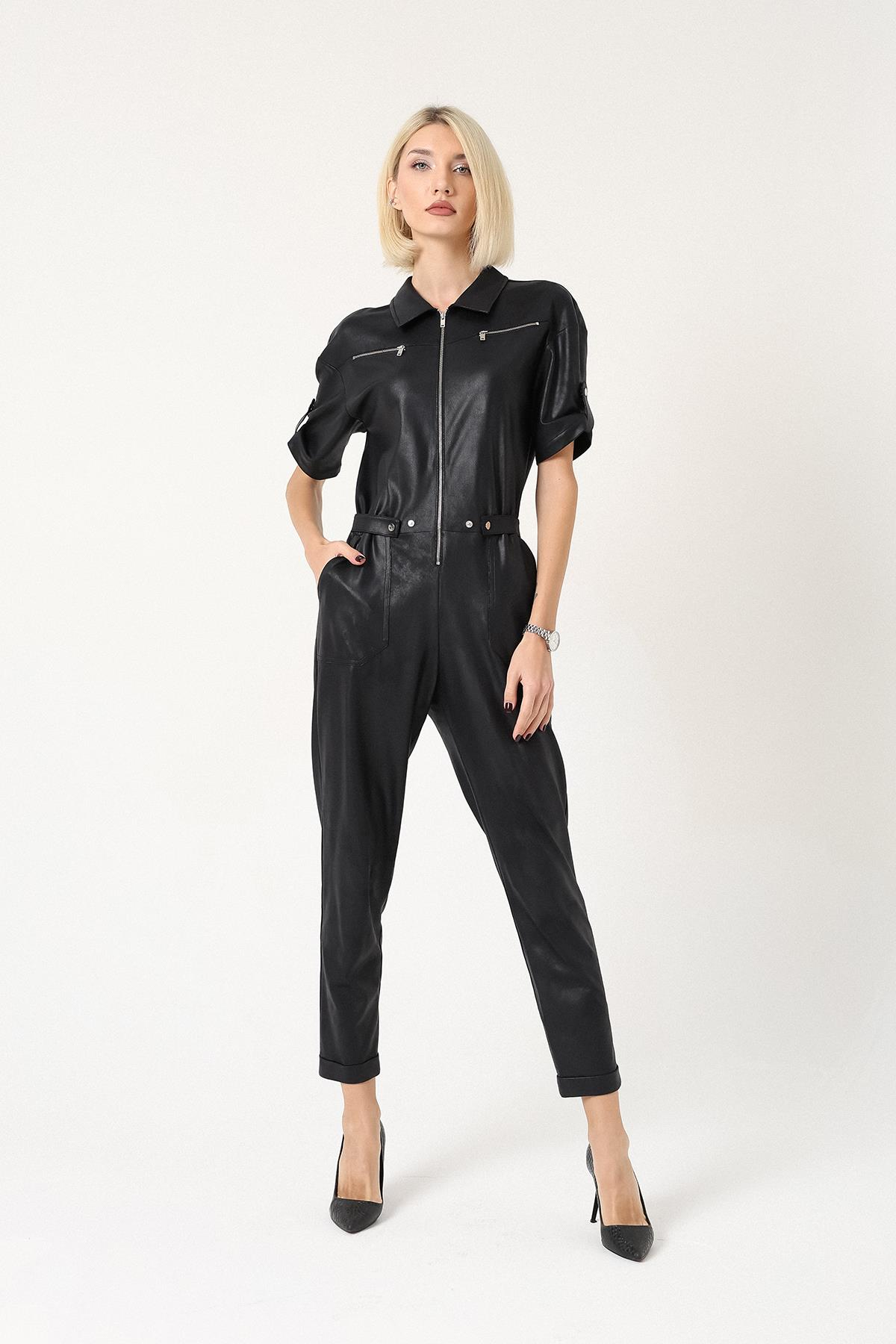 Kadın Siyah Deri Görünümlü Fermuarlı Tulum