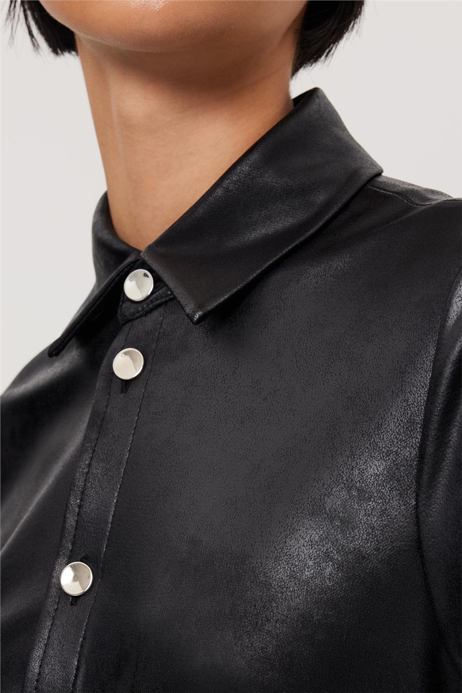 Kadın Siyah Deri Görünümlü Gömlek Yaka Uzun Kollu Önden Yarım Düğmeli Elbise