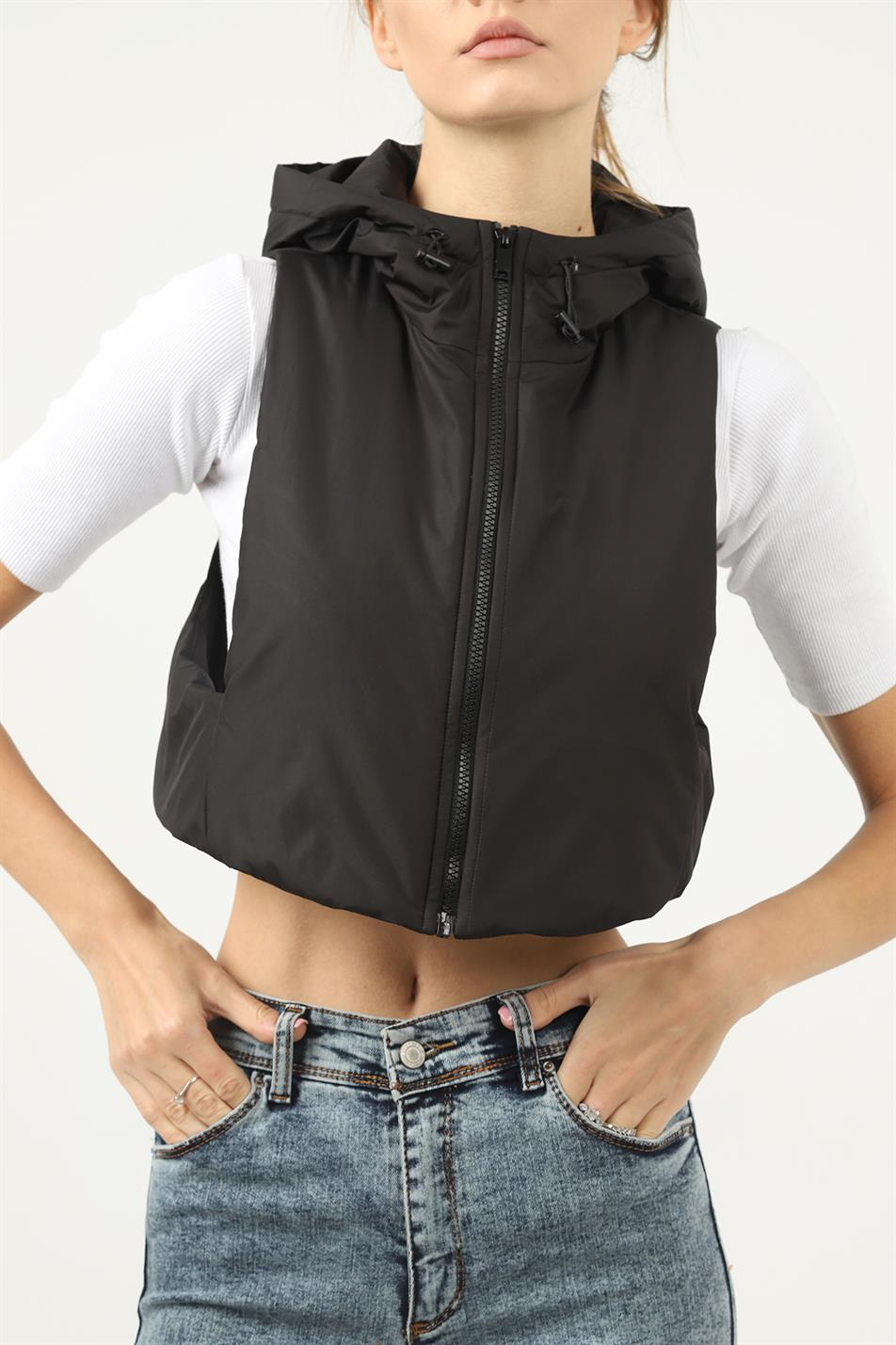 Greno Kadın Siyah Deri Görünümlü Önü Fermuarlı Ve Kapüşonlu Şişme Yelek Ivan-12