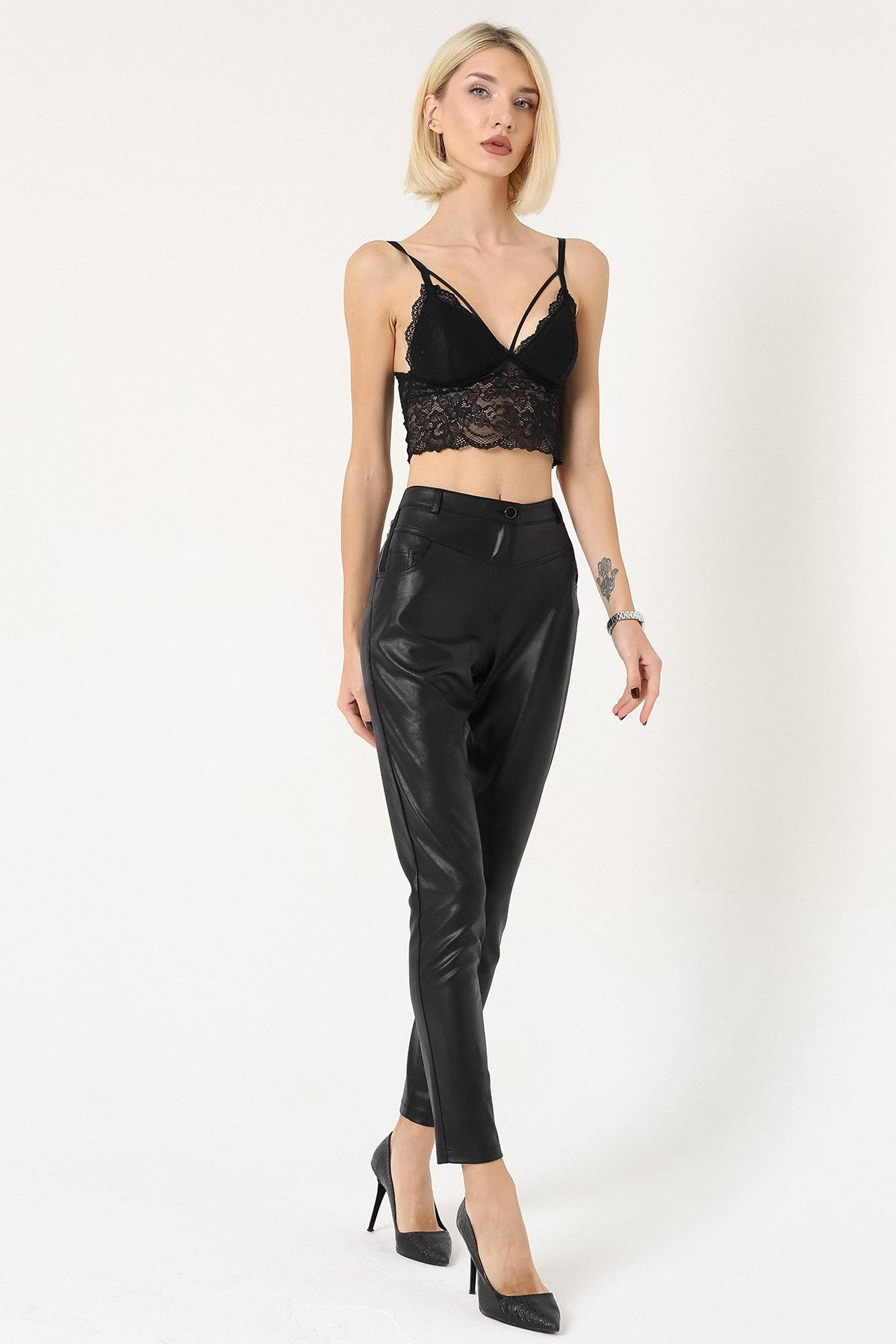 Kadın Deri Görünümlü Cepli Siyah Pantolon