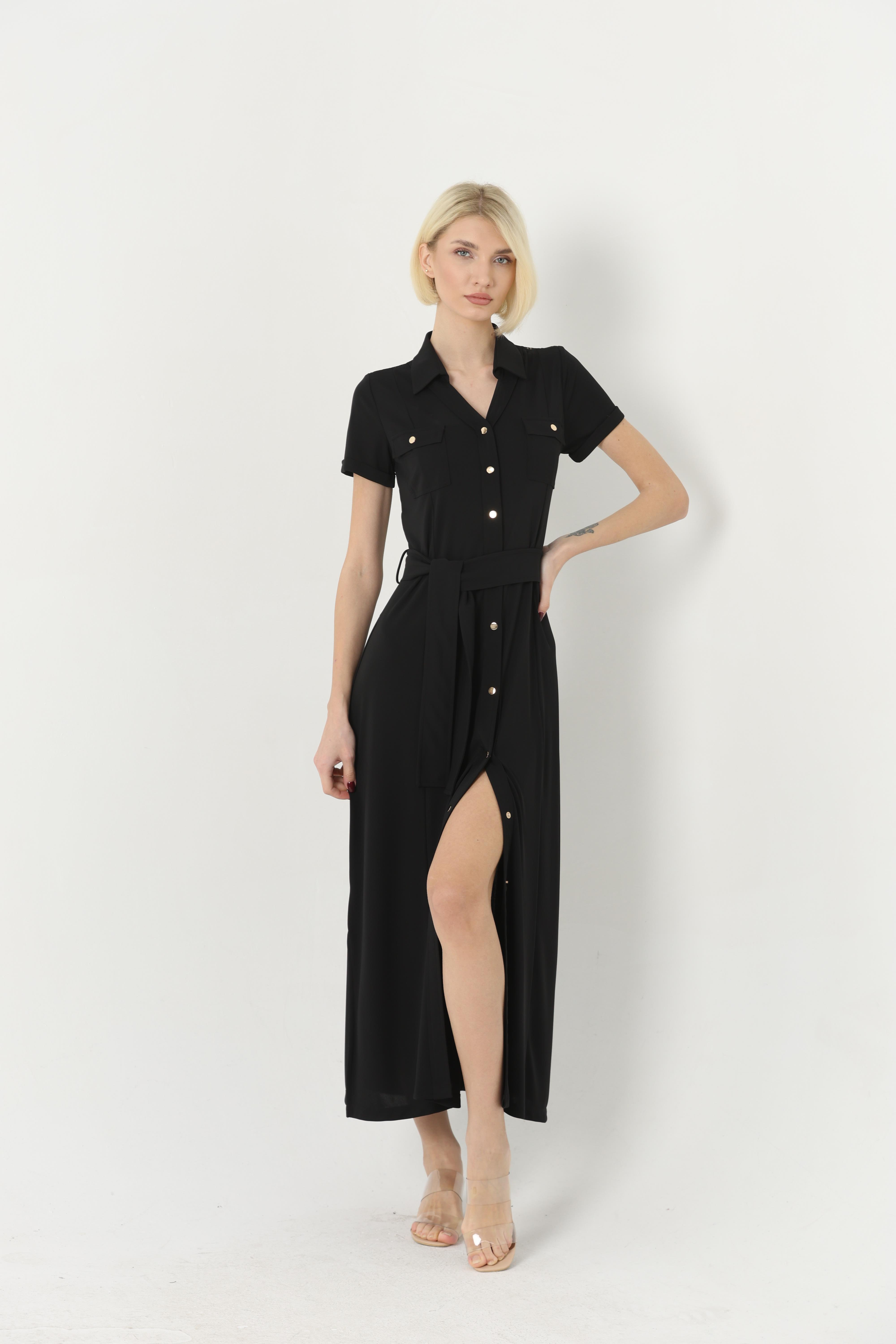 Kadın Önden Çıtçıtlı Kısa Kollu Kemerli Gömlek Yaka Uzun Elbise