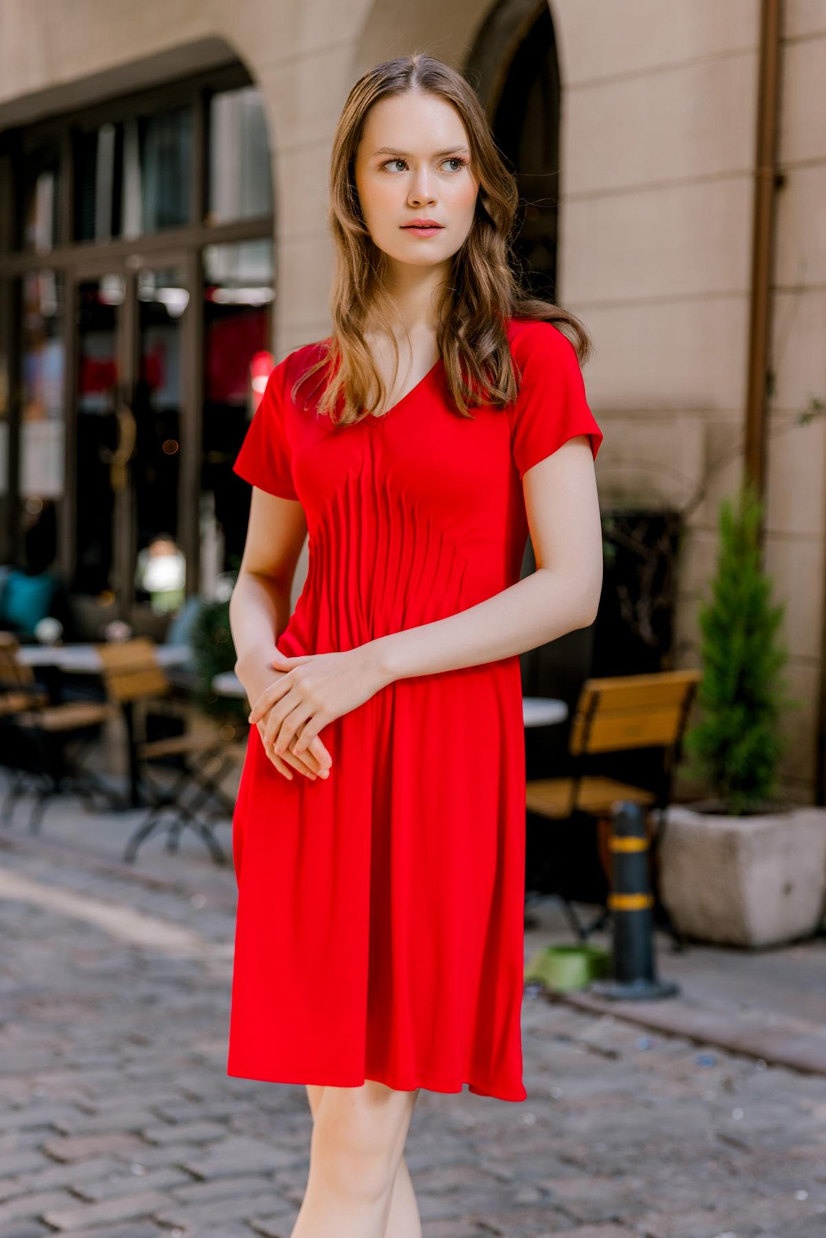 Kadın V Yaka Önü Pliseli Kırmızı Elbise